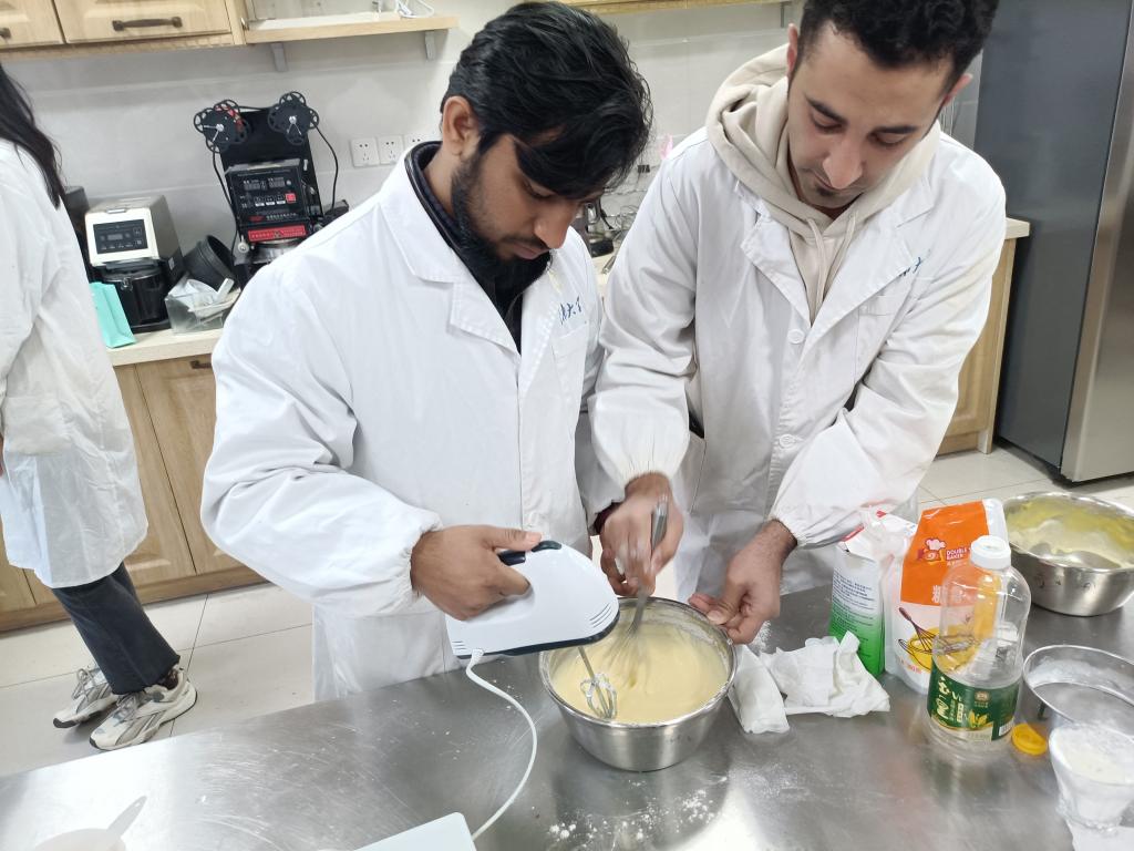 随后,进入烘焙环节,现场同学分为两组,在烘焙俱乐部成员指导下进行面点制作和烘焙,一组制作戚风蛋糕,一组制作桃山皮月饼,中西点心碰撞,趣味性十足。在制作过程中,中国学生热情、耐心地讲解制作细节,留学生们认真学习,展示出了独特的烘焙天赋。在欢声笑语中,桃山皮月饼和戚风蛋糕前期准备完成,进入了烘烤阶段。