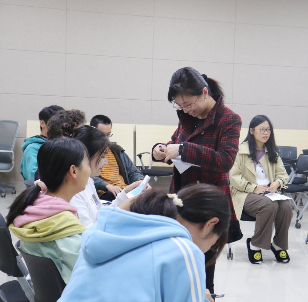 活动伊始,胡晓丹老师简单讲述了本次团体辅导活动的主题和目标,向参与活动的同学强调团体辅导活动的相关规范。随后,胡老师带领同学们展开破冰团辅活动。