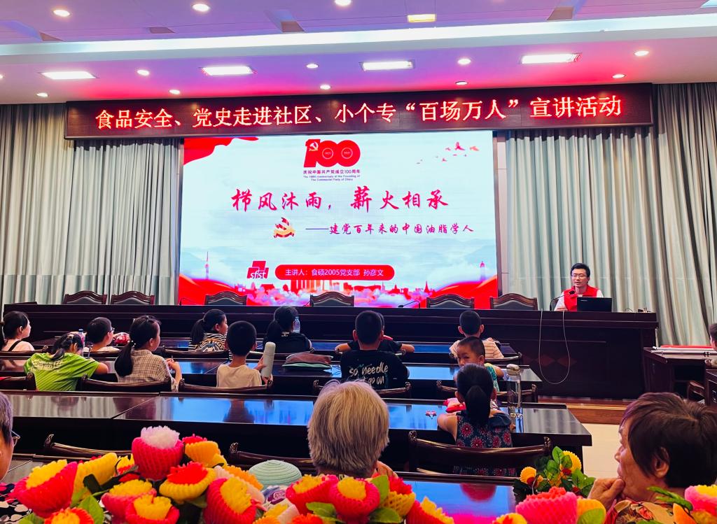 7月20日,团队走进隐秀苑社区,在结束食品安全知识讲解后,团队成员为现场的小朋友们介绍了建党100周年以来的中国油脂学人,将党史学习教育和食品学科相结合,提高党史学习教育的丰富性。7月22日,团队成员在富润社区讲解“过敏食品”“保健食品”相关知识,随后进行了“弘扬抗战精神 牢记时代使命”微党课,结合党史理论宣讲,打造面向大众的、具有食品特色的志愿服务。