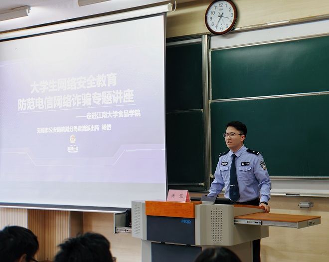 2022级本科新生网络安全教育专题讲座在第一教学楼B103教室顺利举行。本次活动特邀无锡市公安局滨湖分局雪浪派出所警官杨恺作报告,2022级本科新生辅导员张任担任主持。