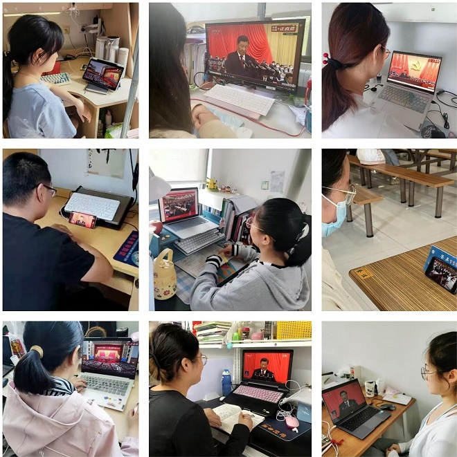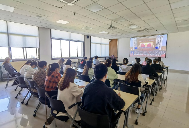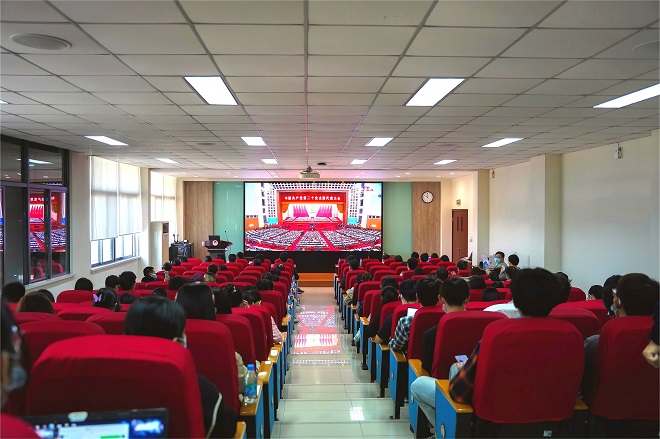 组织师生代表分别在食品楼D910、D912和D916会议室集体观看大会盛况。