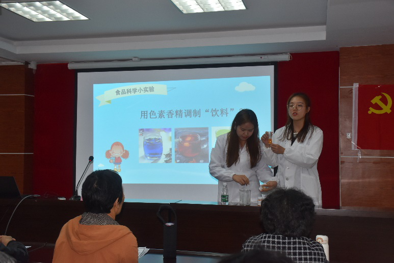 活动伊始,刘心怡同志和何瑞同志一起向社区居民互动演示了“色素香精调饮料”和“非油炸食品是否真的不含油”两个小实验,实验结果表明饮料可以只通过色素香精来快速合成,非油炸食品也很有可能含有油,他们呼吁大家注意健康饮食,理性选择食品。