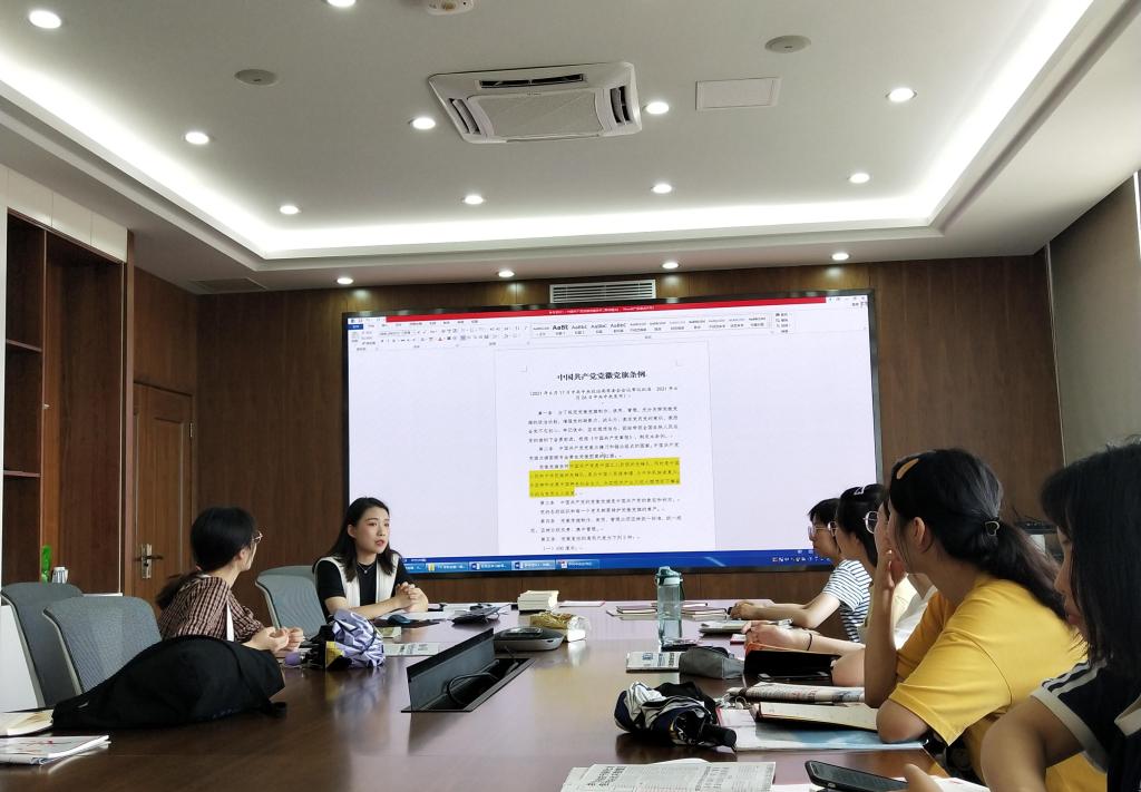 会上,党支部书记胡晓丹带领全体党员集中学习了习近平总书记在庆祝中国共产党成立100周年大会上的重要讲话和《中国共产党党徽党旗条例》。她详细讲解了党徽党旗的重要象征意义,强调党徽党旗使用、管理的关键点,要求全体党员在各项工作和活动中自觉规范使用党徽党旗及其图案,尊重和爱护党徽党旗。她希望青年学生党员认真学习领悟“坚持真理、坚守理想,践行初心、担当使命,不怕牺牲、英勇斗争,对党忠诚、不负人民”的伟大建党精神,并结合自身学习、工作和生活实际,深刻体会习近平总书记在“七一”讲话中提出的九个“必须”。