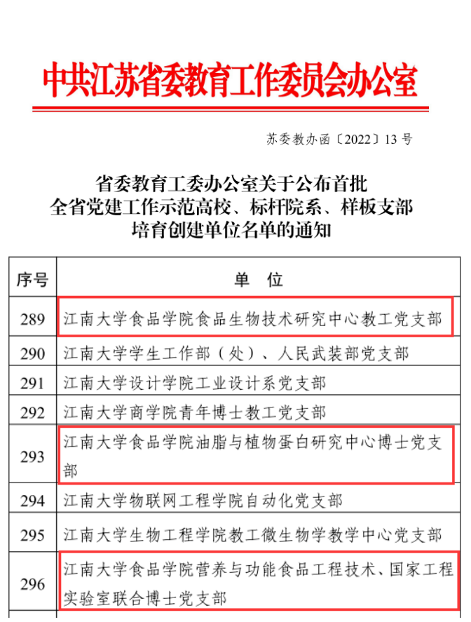 食品生物技术研究中心教工党支部、油脂与植物蛋白研究中心博士党支部,营养与功能食品工程技术、国家工程实验室联合博士党支部入选“首批全省党建工作样板支部”培育创建单位。