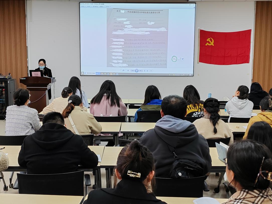 发展党员工作实施细则》。她介绍了学院学生党员的总体情况,对在场的基层党务工作人员培训了党员发展流程和党员发展材料撰写要求,强调了发展党员工作的注意事项等。最后,张任就近期党建工作予以提示,详细介绍了组织生活月报表的填写要求,她强调各支部要严肃对待近期开展的民主评议工作。