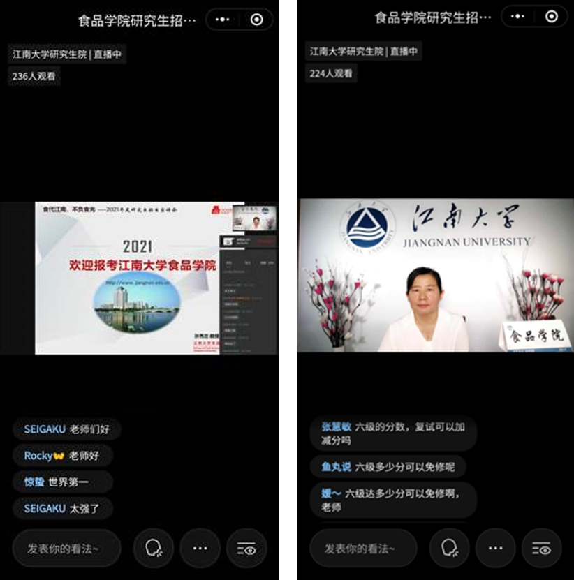 在研究生培养上的创新理念和举措,以及一流学科的风采,并详细介绍了推免生、公开招考考生的报考流程、方法,欢迎考生们报考江大食品,“成为梦想开始的地方,融化温暖的江南记忆”;接着,孙秀兰副院长就同学们关心的“2021年招生计划”、“六级成绩是否影响报考”、“导师招生名额”、“专硕和学硕的区别”、“专业课考试内容”、“推免生复试流程”等问题一一作了详细的解答。直播过程愉快而热烈,共有388人参与直播,直播时长1小时8分钟,很多同学在直播结束后还意犹未尽。