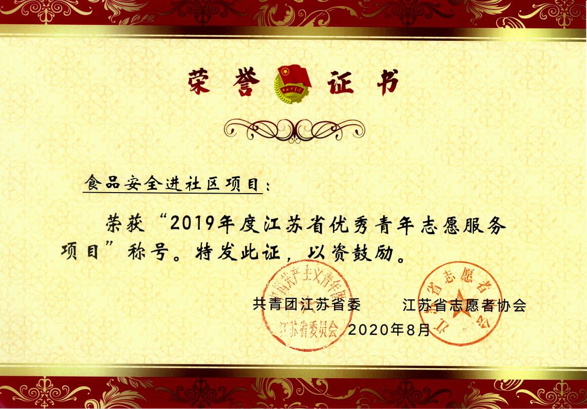 “食品安全进社区”项目荣获“2019年度江苏省优秀青年志愿服务项目”称号,为91猫先生