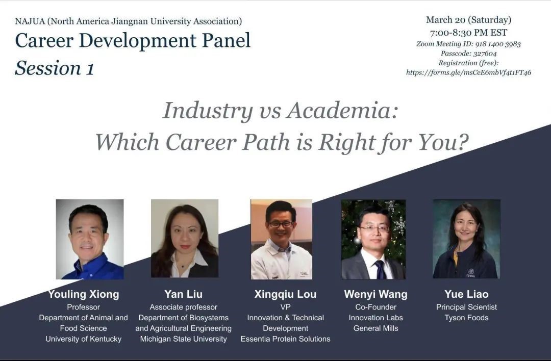 共同主办“北美校友会杰出校友职业发展论坛”第一期,就“工业界vs学术界:哪种更适合你?”这一主题进行了探讨。论坛由校友Yuting Zhou主持,肯塔基大学熊幼翎教授、密歇根州立大学刘岩副教授、Proliant公司楼星球副总裁、通用磨坊创新实验室联合创始人王文一、泰森食品首席科学家廖悦作为论坛嘉宾分别从工业界、学术界两个层次分享了他们职业生涯的经验、建议及相关信息,以帮助校友及海内外学生制定正确的职业发展规划。
