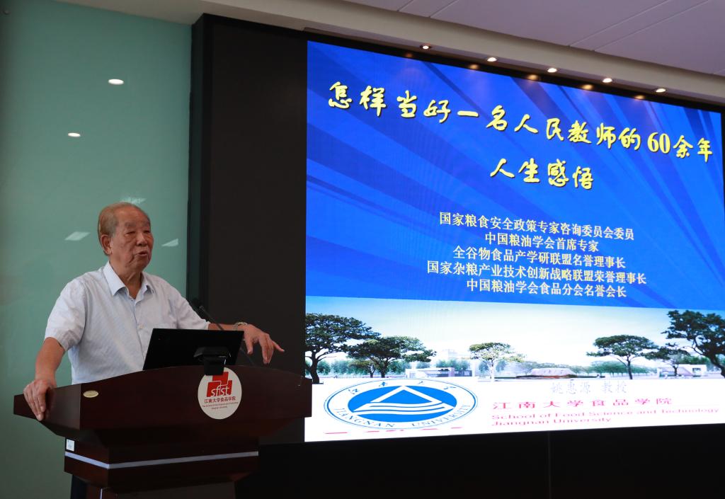 首任院长、全国优秀教师姚惠源老师亲临开班仪式现场,他结合习近平总书记对教师的寄语,以“怎样当好一名人民教师”为题,分享了自己从教60余年的经历和体悟,他语重心长地说自己生在旧社会、长在新中国,“社会主义事业的责任感”是一辈子不论在“顺境”或“逆境”下艰苦创业、奋发前进的原动力,作为高校教师要一切从学生出发,在课堂教学中将传授知识和传递价值有机统一,科学研究中深入基层、着眼问题“接地气”,深耕精作、求真务实,用心托举和传承中国食品强国梦。