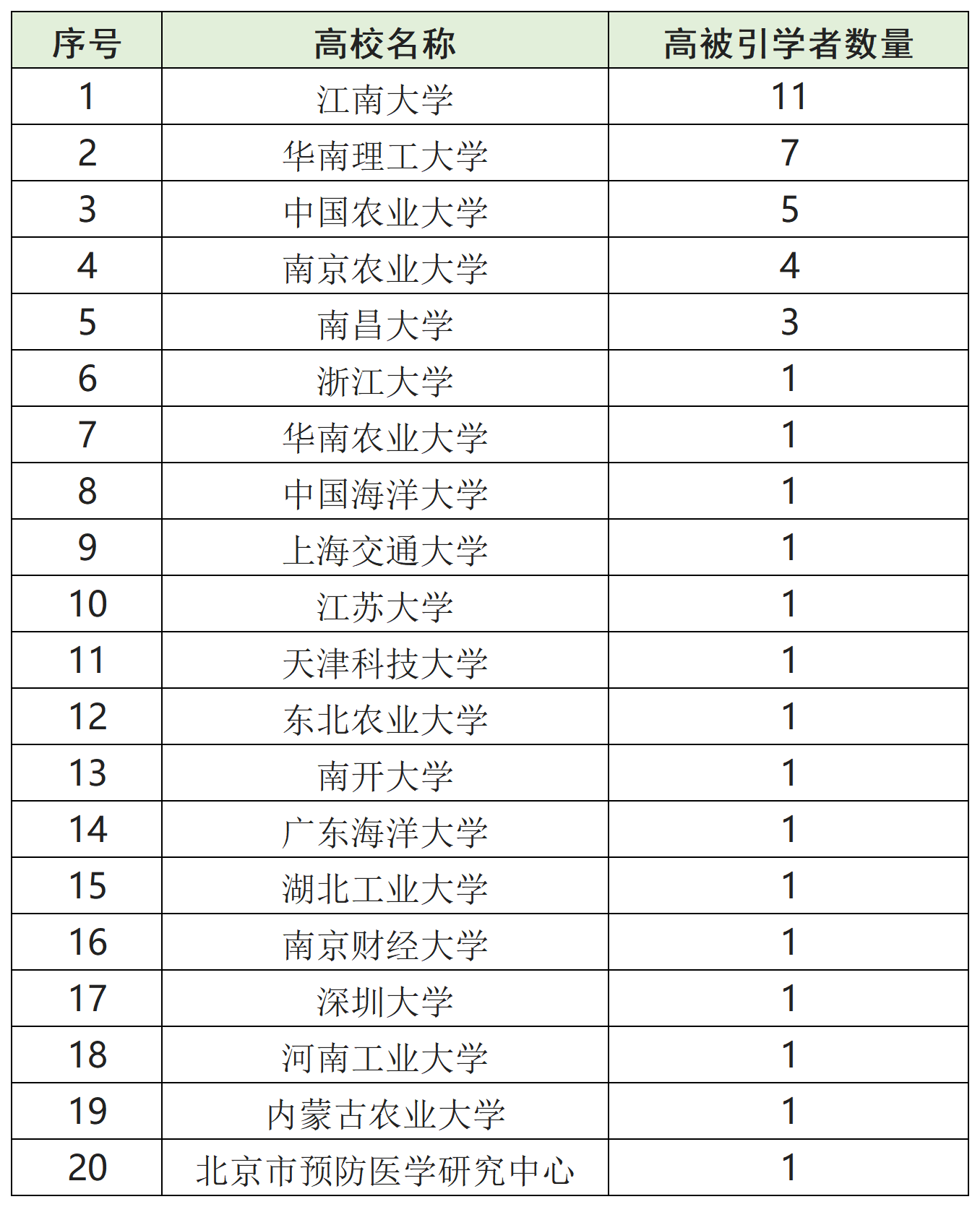 张慜、夏文水、严秀平、张晓鸣、胥传来、金征宇、匡华、乐国伟、王周平、钟芳10名教授入选食品科学与工程学科高被引学者榜单。据悉,2021年入选爱思唯尔中国高被引学者榜单的中国学者共计4701名,其中,食品科学与工程学科共有20所高校及科研院所45名中国学者入选榜单。