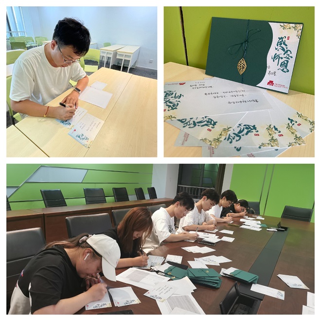 营造了暖心氛围。食品学子在学院一楼大厅布置“教师-中秋”双节主题展板,为学院增添节日氛围。研究生会、学生会围绕师生交流的点点滴滴,精心设计制作了主题贺卡,手写真挚祝福,将贺卡与鲜花送到了老师们手上。同学们在卡片上写道“课内课外,还是线上线下,老师们都是学生为学、为事、为人的榜样”“老师给予食品学子追寻真理与梦想的力量”“一朝沐杏雨,一生念师恩”等内容。这些都是食品学子对老师们发自内心的感恩。