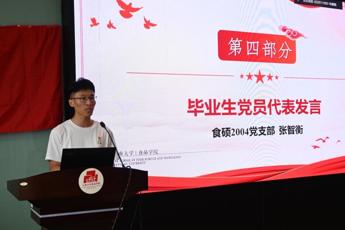 食硕2004党支部张智衡同志作为毕业生党员代表发言。他认为如何应对百年未有之大变局,是每一名青年党员必须思考的重要问题。他坚信毕业生们都能练就过硬本领,在实践中求真知,在发展中建新功。