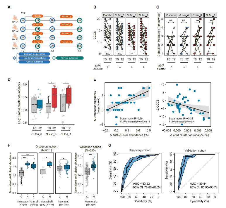 陈卫院士团队长期致力于益生菌的菌种资源挖掘、功能解析和产业化应用,采样地遍布中国29省131县区,共收集健康人体粪便、发酵食品等样本8000余份,分离菌种25000余株,对其中8000余株菌株进行全基因组测序,极大推动了中国益生菌产业的高质量发展。研究人员从354名年龄在0-108岁的中国人体内分离出185株长双歧杆菌。通过便秘小鼠模型确定有效缓解便秘的长双歧杆菌菌株具有独特的abfA基因簇,并在临床试验中得到验证。进一步研究表明,除长双歧杆菌外,对于其它肠道微生物(如拟杆菌等)来说,abfA基因簇的存在与否与其缓解便秘的效果同样相关,同时证明功能性便秘患者肠道菌群中abfA基因簇丰度显著低于健康人,移植高abfA基因簇丰度粪菌可使无菌鼠便秘症状得到改善。此外,团队还发现,肠道微生物abfA基因簇丰度可以作为预测功能性便秘的生物标志物。