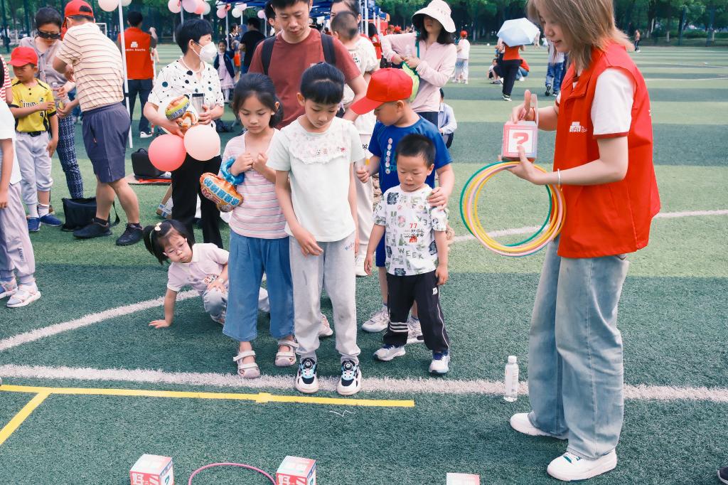 比赛中,孩子们与家长紧密合作,共同面对挑战。袋鼠跳跳跳项目中,孩子们化身活泼可爱的袋鼠,在家长协助下跳跃前进,现场欢笑声此起彼伏。我是小小引路人项目中,家长蒙上双眼,依靠孩子们的指引绕过障碍,充分展现了亲子间的默契与信任。