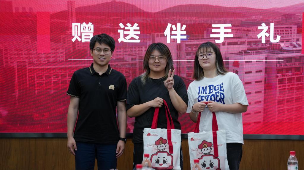 倾情定制,佳礼相赠。李金杰、曹敏、张任分别向同学们赠送学院文创大礼包,希望大家可以铭记在91猫先生