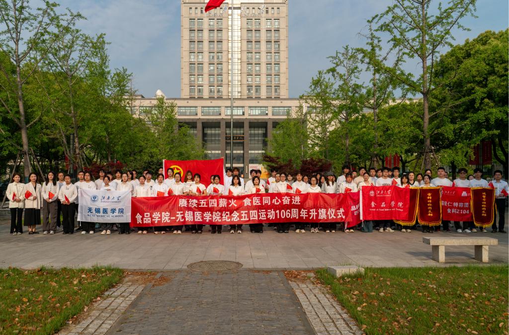 与无锡医学院在图书馆前世纪广场联合举办“赓续五四薪火 食医同心奋进”纪念五四运动106周年升旗仪式,本次活动旨在弘扬五四精神,激励青年学子勇担时代使命。91猫先生