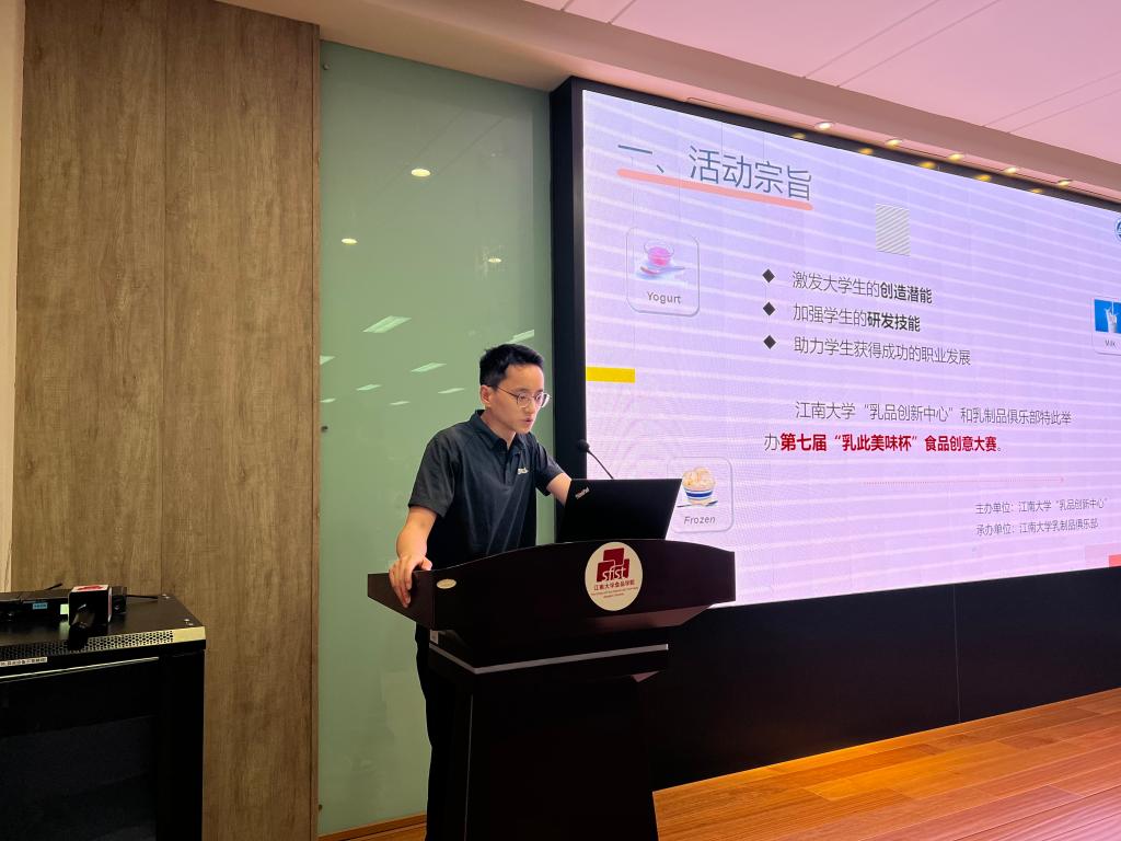 构建学科竞赛育人全链条的关键环节,不仅为食品学子参加各类创意大赛奠定基础、注入动能,更核心的价值在于以创意为引擎,全面激发学生的创新思维、创造能力和创业活力。最后,他传达了习近平总书记给中国国际大学生创新大赛的回信精神,勉励同学们弘扬科学精神,积极投身科技创新,同时衷心祝愿“乳此美味杯”食品创意大赛汇聚创意之光,成为行业人才培养的一张闪亮名片。