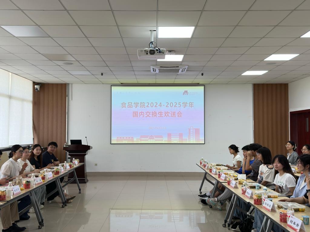 2024-2025学年国内交换生欢送会在D916会议室举办。党委副书记兼副院长李雷、2022级本科生辅导员张任、2023级本科生辅导员崔家玮及来自茅台学院、山西师范大学、石河子大学、新疆农业大学、台湾实践大学的29名交换生参加活动。座谈会由崔家玮主持。
