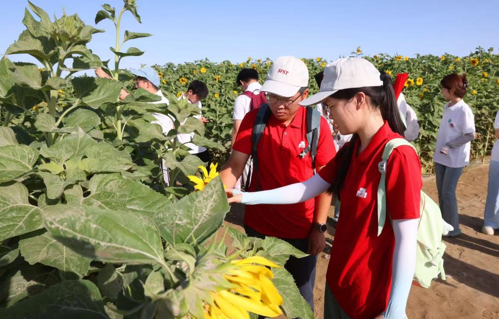 7月13日,实践团抵达224团新开发的7.38万亩土地。在当地农户的陪同下,参观沙漠中顽强生长的石葵、土豆和西瓜等农作物。得益于干旱气候与充足日照,这些农作物不仅含糖量高,更富含维生素和天然矿物质。从作物的沙漠种植技术到全面覆盖的滴灌、喷灌系统,队员们无不为这一工程奇迹所震撼。汽车穿行在沙漠公路上,一路伴随着一望无垠的沙漠。在塔克拉玛干沙漠边缘驻足时,讲解员为队员们详细介绍了大漠边疆的“锁边工程”——长达3000余公里的绿色阻沙带和30余万亩的良田,共同铸就了全球荒漠化治理的典范。随后,队员们走进茫茫大漠,切身感受壮美无垠的瀚海与铺天盖地的风沙。从“锁边”到“扩绿”,正是戍边战士与技术人员日夜兼程、攻克难关,才成就了这一壮举,谱写了从沙漠到绿洲的时代新篇。