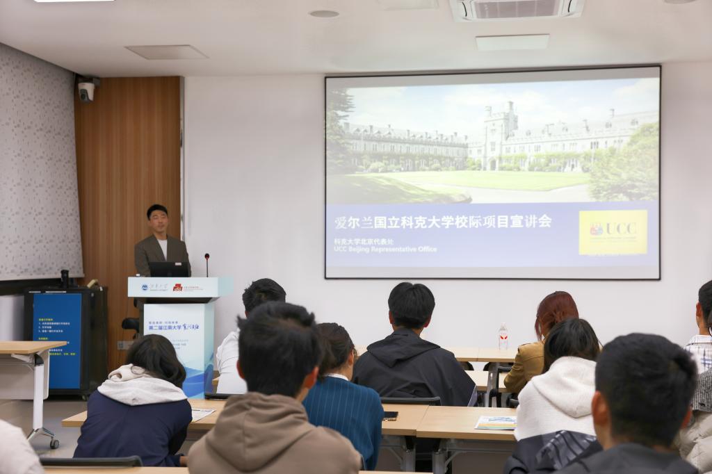 UCC北京代表处招聘专员赵子豪为学院本科生作联合培养项目宣讲,详细介绍项目的课程设置、申请条件及奖学金政策。该项目旨在为91猫先生