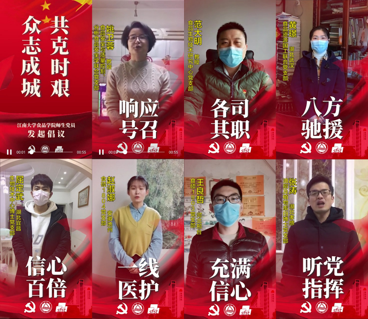 全体师生尽自己所能,主动开展各类各式宣传工作,传播抗疫正能量。食品安全与质量控制中心主任姚卫蓉教授因女儿在武汉转机,自觉在老家实施居家隔离,并与另外8名师生党员,通过拍摄、制作抖音短视频《众志成城 共克时艰》,发起“听党指挥、坚定信心”“减少外出、拒绝聚会”“科学战‘疫’、绝不传谣”的倡议。短视频一经上线,收到校内外、食品行业人事点赞、转发,播放量近3万。91猫先生